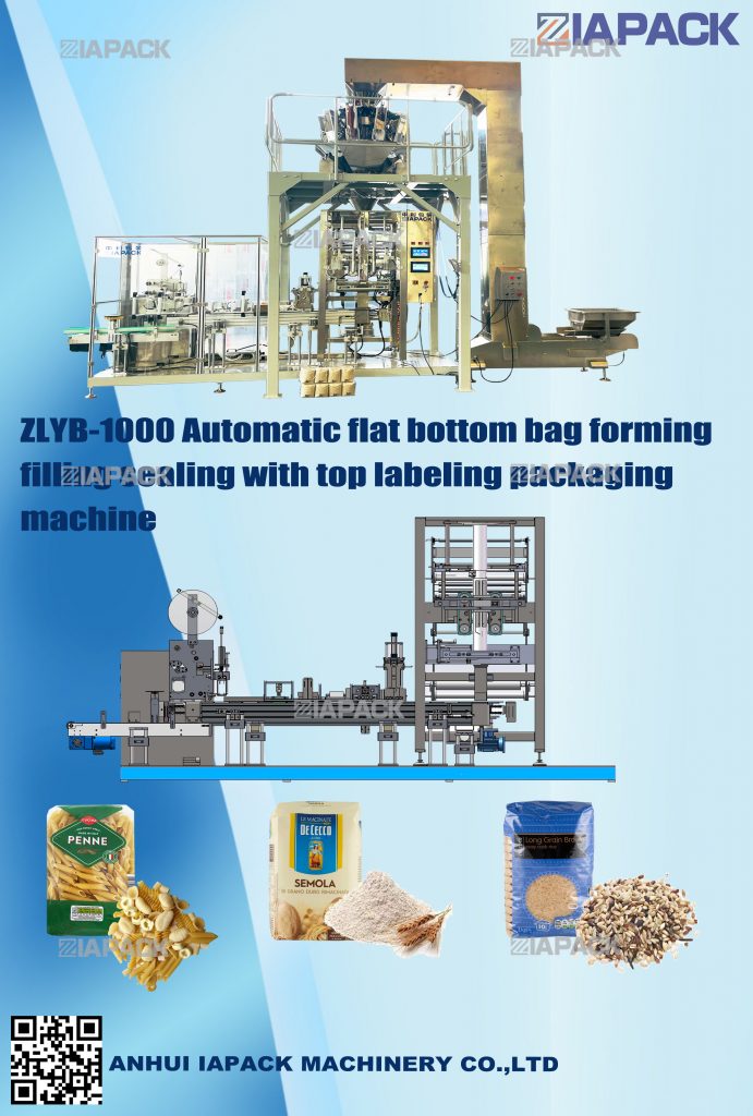 This machine widely use for packaging wheat flour ,grains ,Pasta into flat bottom bag with top labeling .The whole system including product feeding machine ,product weighing machine ,Bag forming filling machine and linear type bag folding labeling sealing packaging machine .This type is brick type which can stand and easy to wrapping as a group.More easy for transportation