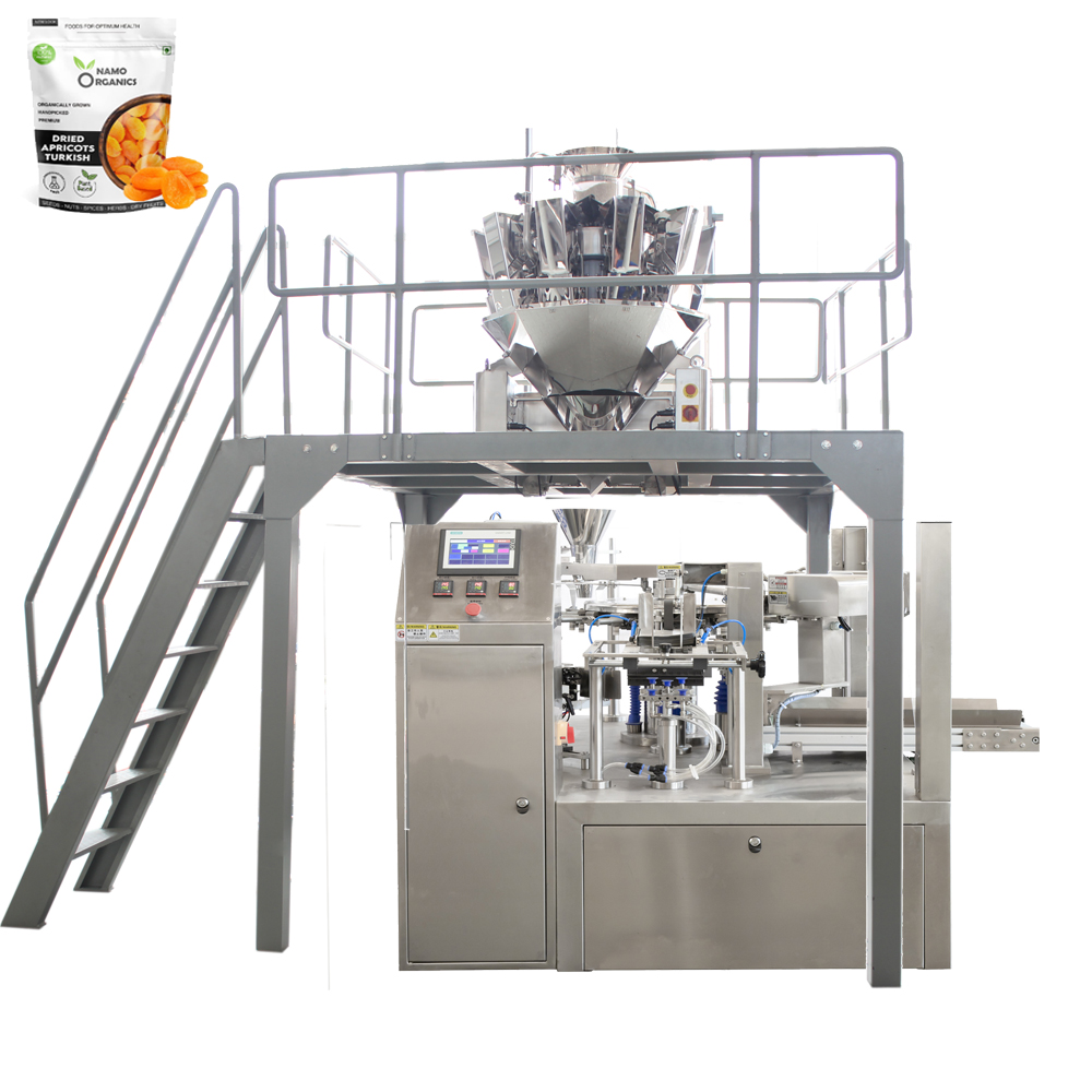 ロータリー袋詰め包装機 粒度、粉体、液体、ペーストなどの自動梱包には、さまざまな投与量(マルチヘッド計量器、オーガフィラー、液体フィラーなど)が適しています。
