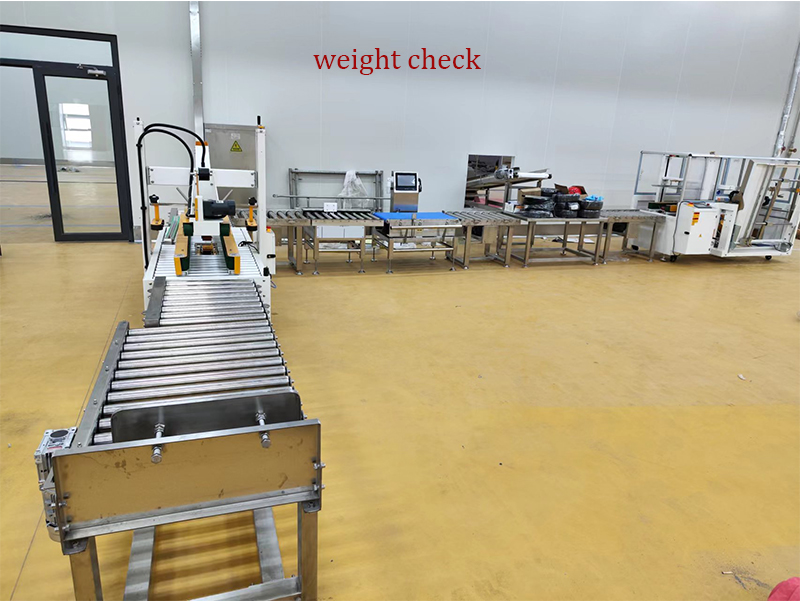 冷凍食品を袋詰めした後、再度重量検知機で重量が目標重量と一致していることを確認した後、金属探知機で袋内に金属が混入していないことを確認します。その後、袋はカートン充填ラインに運ばれます。
