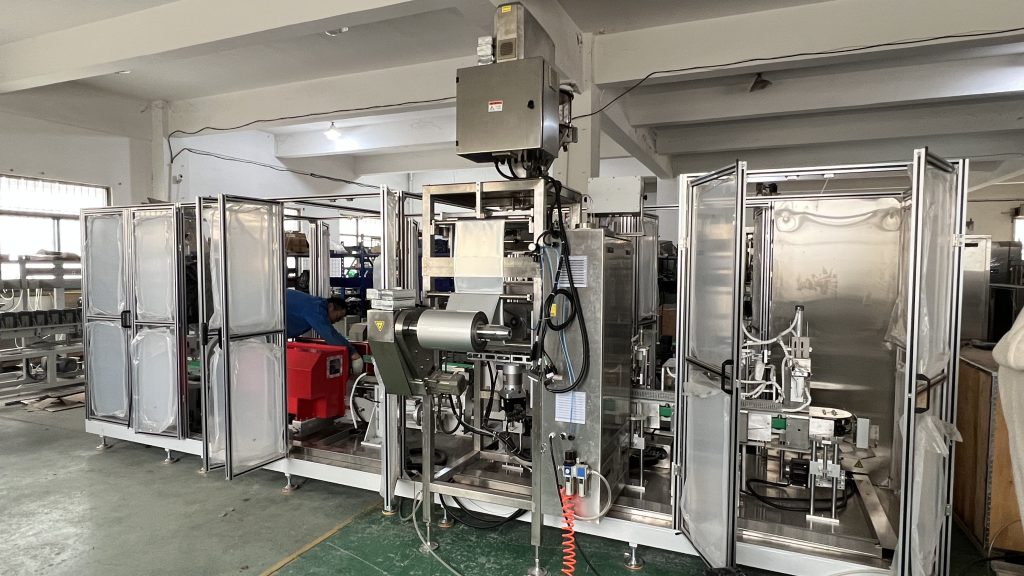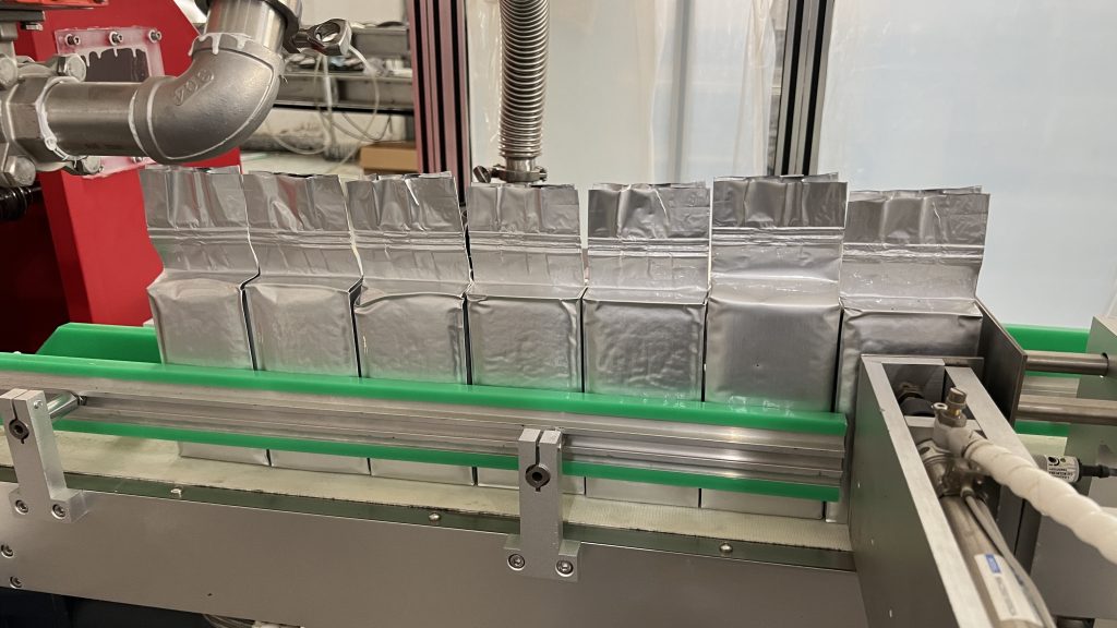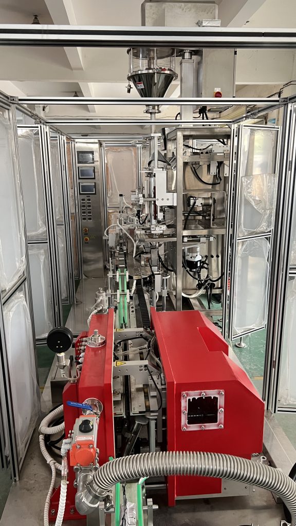 イランからのクライアントは、250グラムのコーヒー粉用の充填包装機を形成する1セットの自動ブリック真空バッグを注文しました。そして、真空チャンバーを警告として赤色に塗装したクライアントの要件に従ってください。