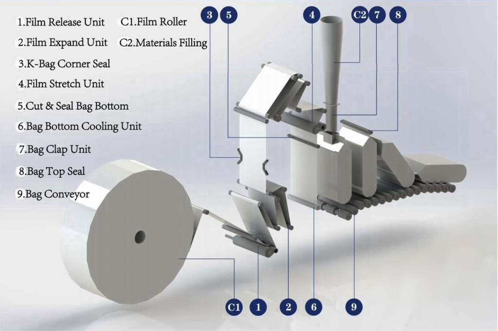 2.標準K型バッグコーナーシール機構により、バッグ包装完成品はより正方形になり、パレット積載後のパレットの安定性が向上します。